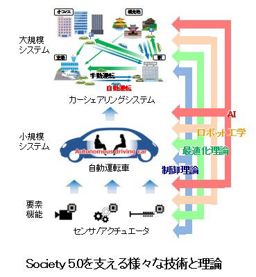 Society5.0の実現には,AI技術やIoT(Internet of Things)技術による膨大な情報のみでは不可能であり,社会システム,ロボット,自動車をはじめ,アクチュエータ,センサ,プロセッサ,通信などのさまざまな技術を必要とします.それらの技術は,高度な制御理論,最適化理論,モデリング理論,数学等の応用が必須となります.つまり,この社会の実現には広い分野の技術や理論とそれらのエキスパートが必要となります.