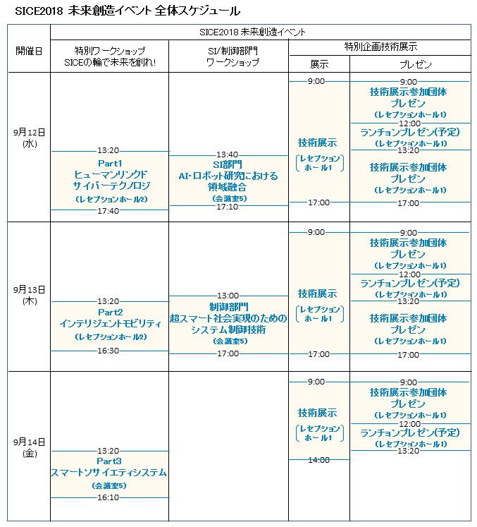2018)の開催に合わせ,同会場にて”SICE2018 未来創造イベント"として以下の三つの特別企画を開催いたします.